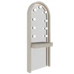Corpul este lăcuit, iar blatul este fabricat din MDF cu detalii de îmbinare pentru durabilitate și aspect decorativ. Oglinda iluminată cu LED-uri este potrivită pentru un mod de lucru profesional, oferind o distribuție ideală a luminii. Sistemul de iluminare este echipat cu becuri LED.