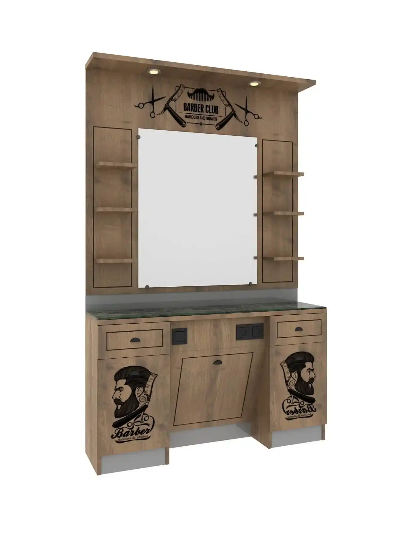 Elementul central îl reprezintă cele două oglinzi mari cu iluminare LED integrată, care asigură o lumină uniformă și clară, perfectă pentru realizarea serviciilor profesionale de frizerie. Iluminarea subtilă contribuie atât la confortul vizual al stilistului, cât și la o experiență plăcută pentru client.