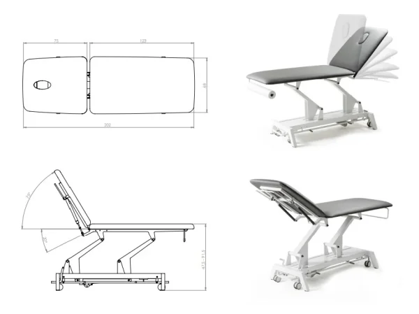 Masa electrica este un echipament modern si versatil, conceput pentru a asigura confortul maxim al clientului si usurinta in utilizare pentru specialisti. Aceasta permite reglarea automata a inaltimii si a unghiului spatarului, facilitand adaptarea pozitiei in functie de necesitatile fiecarui tratament. Datorita motorului electric, patul poate fi ajustat rapid si silentios, economisind timp și oferind o experienta relaxanta.